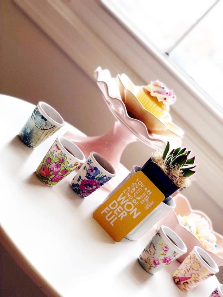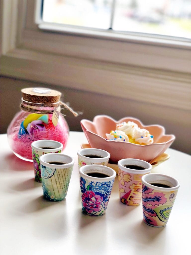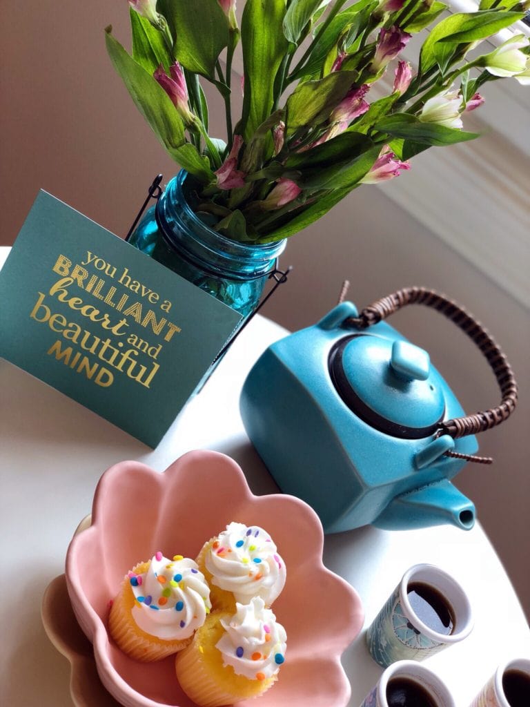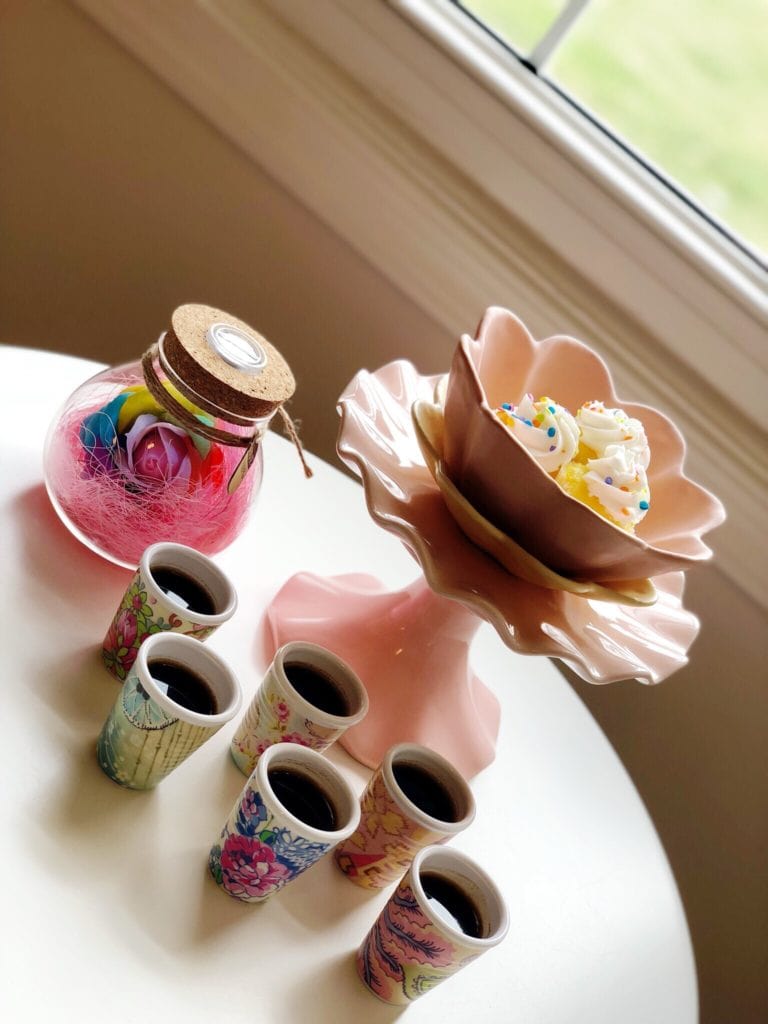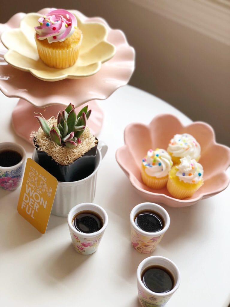 I had recently ordered a few fun new decor pieces, and I mixed them with a few things that I already had on hand. I whipped up a simple little dessert ahead of time (check out the simple recipe at the end of this post). Picked up a few cupcakes at the grocery store. Brewed a fresh pot of strong coffee (basically espresso). And turned a simple morning into a more memorable one with some much-needed time with my dear friend.