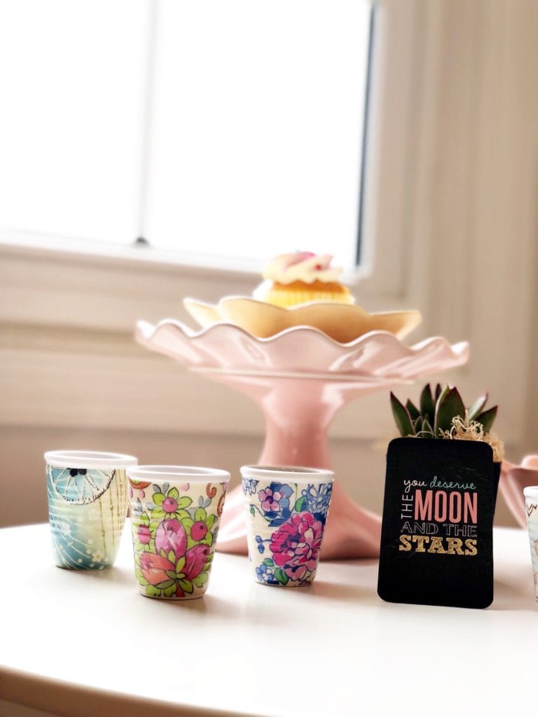I also played around with the arrangement a bit to showcase what it could look like if you had more than one special guest, or if you wanted to do more of a grab and go. I love the idea of sitting around the family room or out on the patio with a simple, beautiful table of treats. And the cards with inspirational quotes on them add some extra personality and warmth to the table as well!