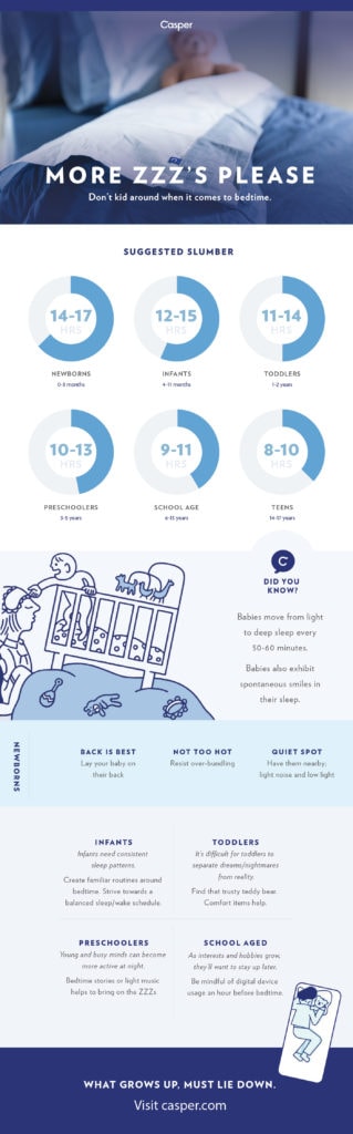 The better sleep enthusiasts at Casper Mattresses understand that what grows up, must lie down. Bedtime essentials are just as important as the hours of rest required – for both Mom, Dad, & baby alike. Check out the guide below to help you make the most of your little one’s dreamy hours